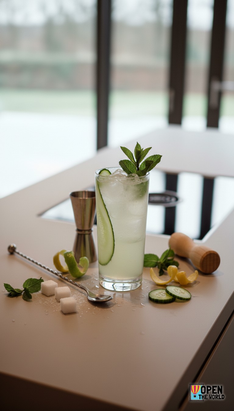 - Garnish: Cucumber ribbon and a fresh mint sprig